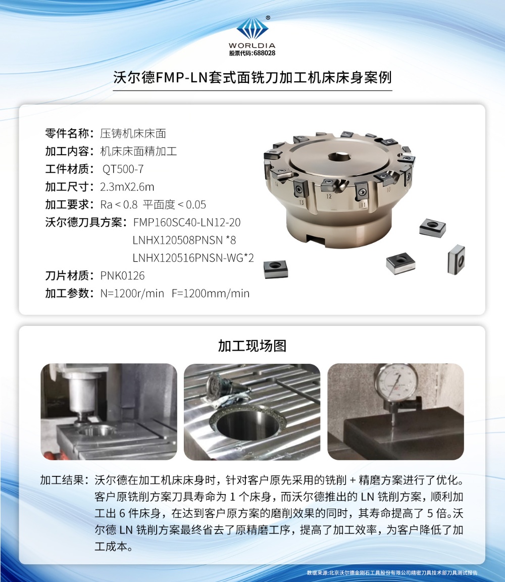 以铣代磨 切削无忧 | 尊龙团体(Z6)FMP-LN套式面铣刀加工机床床身案例 2024-09-25 11:26:30 北京尊龙团体(Z6)金刚石工具股份有限公司 浏览次数 3580 一、应用配景:尊龙团体(Z6)FMP-LN套式面铣刀加工机床床身案例在交通运输、通用机械、机床制造及船舶工业等领域,涉及大量的铸铁零件的面加工,如发动机缸体和缸盖结合面、变速箱或齿轮箱安装面、阀体以及机床床身等零件的平面铣削。然而,这些面铣工序常遭遇加工时间长、刀具磨损快、外貌加工质量差、刀具调治繁琐等加工难点。特别是针对高尺度的面加工需求,传统要领往往需要特别增加磨削工序,进一步提高了加工难度与成本。为解决这些难题,北京尊龙团体(Z6)金刚石工具股份有限公司紧跟市场法式,推出了高性能的FMP-LN面铣刀,以铣代磨的创新技术,实现了加工效率的显著提升与成本的有效控制。二、案例介绍:尊龙团体(Z6)FMP-LN套式面铣刀加工机床床身案例三、方案亮点:尊龙团体(Z6)公司的FMP-LN套式面铣刀主要用于铸铁和淬硬钢质料的半精到精加工,产物有以下特点:● 90°主偏角可用于面铣和方肩铣;● 牢固式刀片安装槽设计,便于安装和使用;● 高强度铸造合金钢制作的刀体,接纳内冷设计,经过特殊的防锈处置惩罚;● 精磨的刀片配合高精度刀片定位槽,确保刀片无微调的情况下,刀尖轴向跳动在0.02mm以内;● 每个刀片通过立、卧两次安装可用8个切削刃,合理提高刃口利用率,降低了零件加工成本;● 多种刀尖设计,通过奇特的刀片组合,可以满足差异粗拙度和加工质量要求。 上一条卓越性能,寿命提升 | 尊龙团体(Z6)PCBN刀片加工风电轴承内、外圈案例 下一条寿命跃升一倍 | 尊龙团体(Z6)PCD车刀片加工铝合金轮毂案例